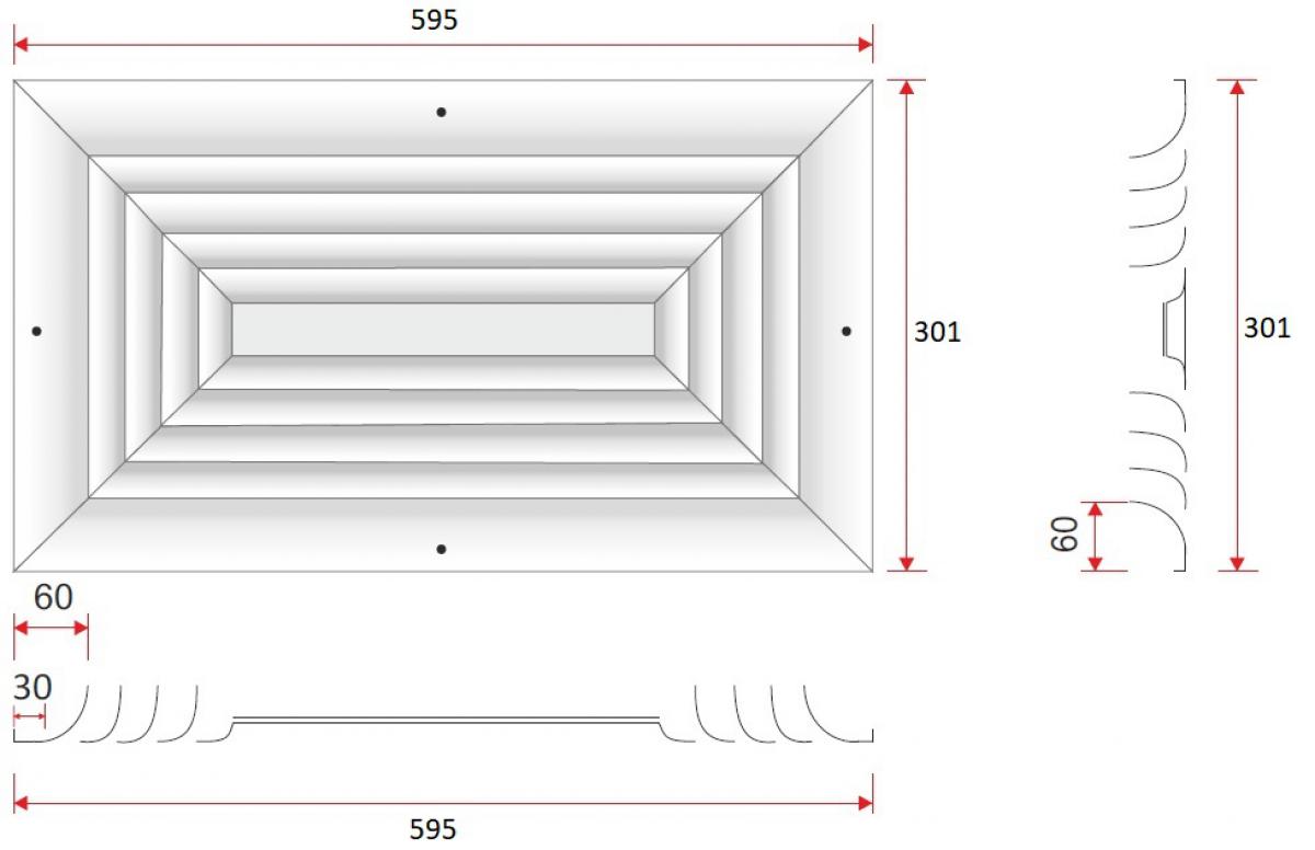 Difuzorius, lubinis, stačiakampio formos, pagamintas iš milteliniu būdu dažyto plieno, RAL9016 spalva, išoriniai matmenys 595x301 mm, oro tekėjimo angos matmenys 475x181 mm, 4 krypčių oro tekėjimas, efektyvus plotas 0.060 m²