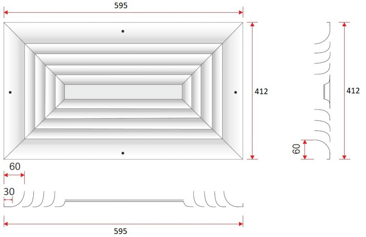 Difuzorius, lubinis, stačiakampio formos, pagamintas iš milteliniu būdu dažyto plieno, RAL9016 spalva, išoriniai matmenys 595x412 mm, oro tekėjimo angos matmenys 475x292 mm, 4 krypčių oro tekėjimas, efektyvus plotas 0.080 m²