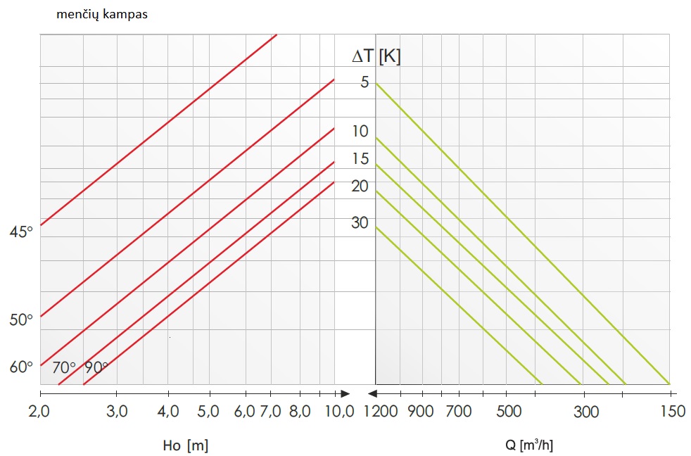 Menčių kampas priklausomai nuo patalpos aukščio, temperatūros ir oro srauto (aušinimas)