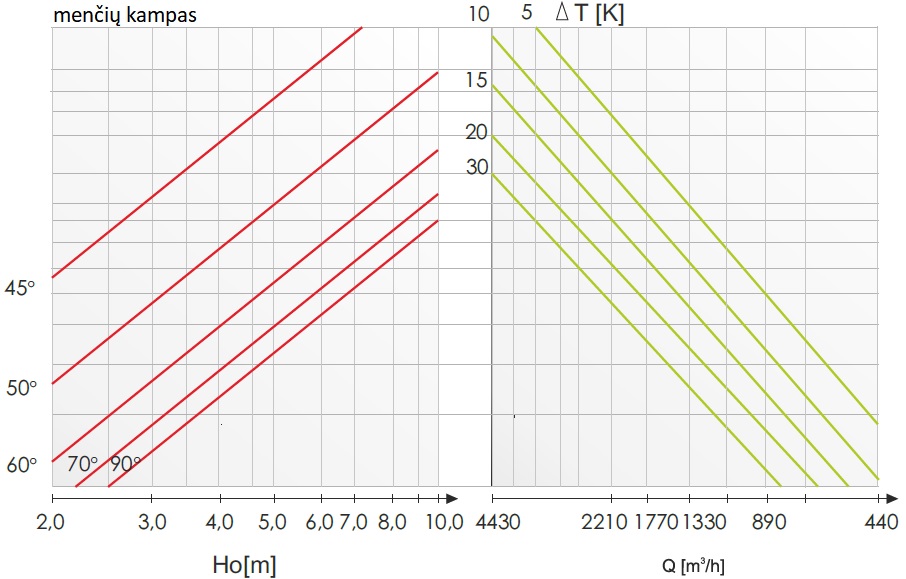 Menčių kampas priklausomai nuo patalpos aukščio, temperatūros ir oro srauto (aušinimas)