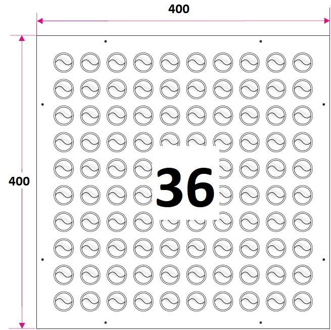 Išoriniai matmenys 400x400 mm, purkštukų kiekis 36 vnt.