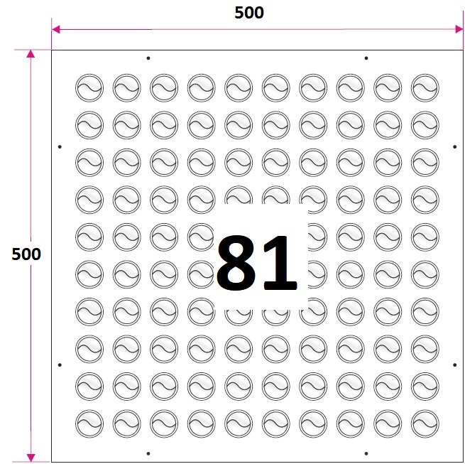 Išoriniai matmenys 500x500 mm, purkštukų kiekis 81 vnt.
