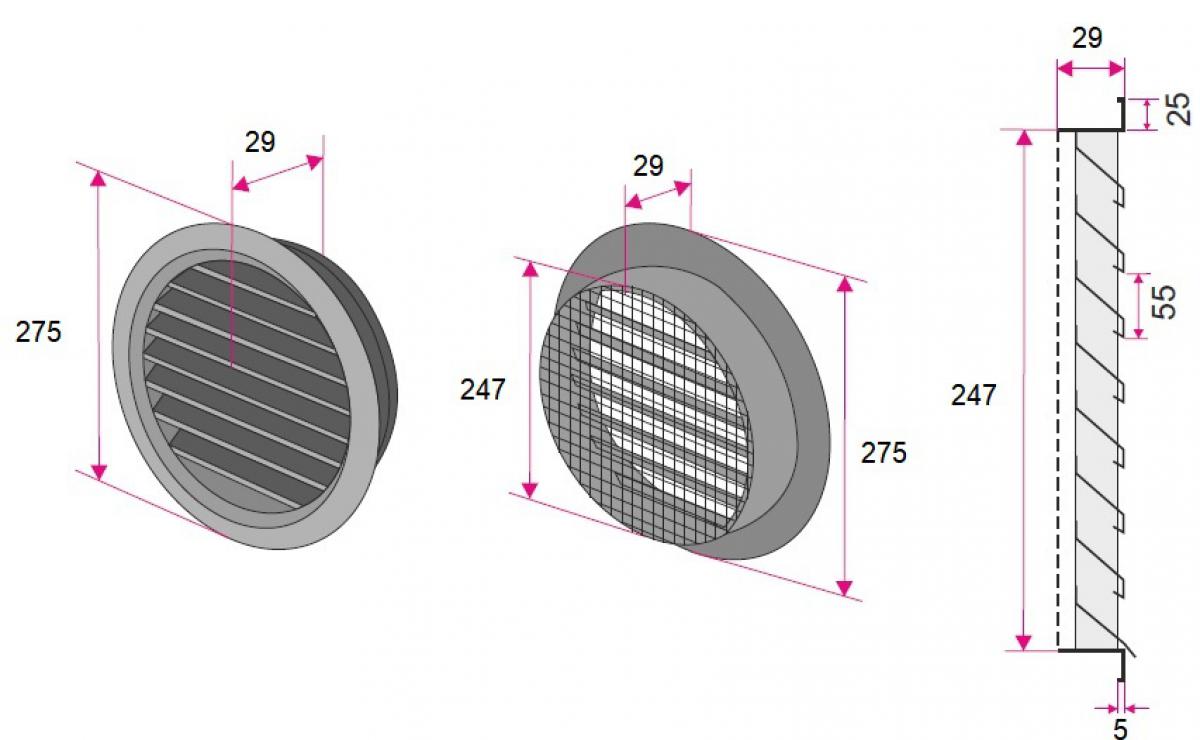 Ventiliacinės grotelės, išorinės, montuojamos sienoje, skirtos oro tiekimui arba šalinimui iš patalpos, apvalios formos, specialios formos horizontaliai išdėstytos nereguliuojamos grotelių mentės apsaugo nuo kritulių, už grotelių esantis tinklelis apsaugo nuo paukščių / graužikų / lapų, pagamintos iš milteliniu būdu dažyto aliuminio, RAL9006 spalva, tvirtinimas varžtais per išorinį rėmelį, montavimo angos diametras Ø250 mm