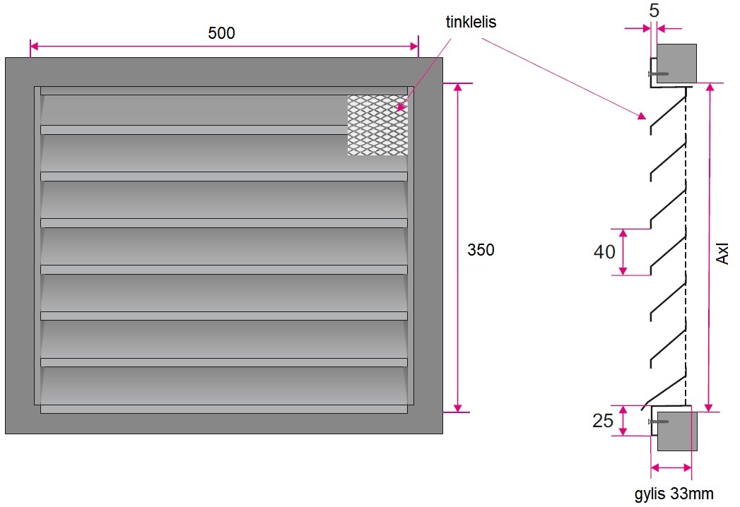 Ventiliacinės grotelės, išorinės, montuojamos sienoje, skirtos oro tiekimui arba šalinimui iš patalpos, stačiakampio formos, specialios formos horizontaliai išdėstytos nereguliuojamos grotelių mentės apsaugo nuo kritulių, atstumas tarp grotelių menčių 40 mm, už grotelių esantis plieninis tinklelis apsaugo nuo paukščių / graužikų / lapų, pagamintos iš milteliniu būdu dažyto cinkuoto plieno, RAL9006 spalva, tvirtinimas varžtais per išorinį rėmelį, montavimo angos matmenys 500x350 mm