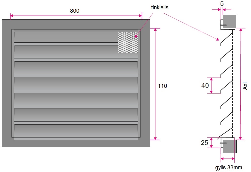 Ventiliacinės grotelės, išorinės, montuojamos sienoje, skirtos oro tiekimui arba šalinimui iš patalpos, stačiakampio formos, specialios formos horizontaliai išdėstytos nereguliuojamos grotelių mentės apsaugo nuo kritulių, atstumas tarp grotelių menčių 40 mm, už grotelių esantis plieninis tinklelis apsaugo nuo paukščių / graužikų / lapų, pagamintos iš milteliniu būdu dažyto cinkuoto plieno, RAL9006 spalva, tvirtinimas varžtais per išorinį rėmelį, montavimo angos matmenys 800x110 mm