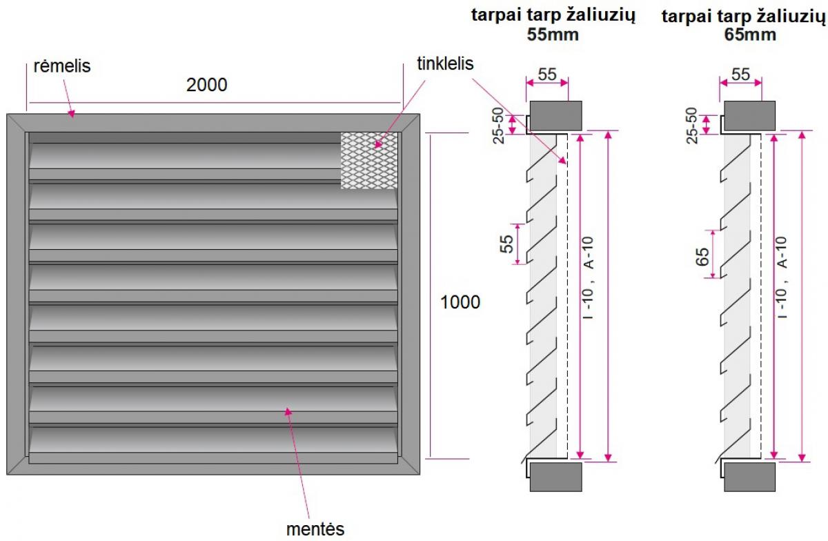 Ventiliacinės grotelės, išorinės, montuojamos sienoje, skirtos oro tiekimui arba šalinimui iš patalpos, stačiakampio formos, specialios formos horizontaliai išdėstytos nereguliuojamos grotelių mentės apsaugo nuo kritulių, atstumas tarp grotelių menčių 55 mm, už grotelių esantis plieninis tinklelis apsaugo nuo paukščių / graužikų / lapų, pagamintos iš milteliniu būdu dažyto cinkuoto plieno, RAL9006 spalva, tvirtinimas varžtais per išorinį rėmelį, montavimo angos matmenys 2000x1000 mm, efektyvus plotas 1.28 m²