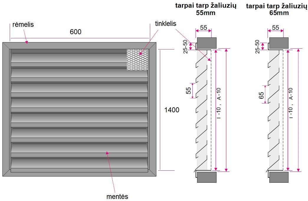 Ventiliacinės grotelės, išorinės, montuojamos sienoje, skirtos oro tiekimui arba šalinimui iš patalpos, stačiakampio formos, specialios formos horizontaliai išdėstytos nereguliuojamos grotelių mentės apsaugo nuo kritulių, atstumas tarp grotelių menčių 55 mm, už grotelių esantis plieninis tinklelis apsaugo nuo paukščių / graužikų / lapų, pagamintos iš milteliniu būdu dažyto cinkuoto plieno, RAL9006 spalva, tvirtinimas varžtais per išorinį rėmelį, montavimo angos matmenys 600x1400 mm, efektyvus plotas 0.53 m²