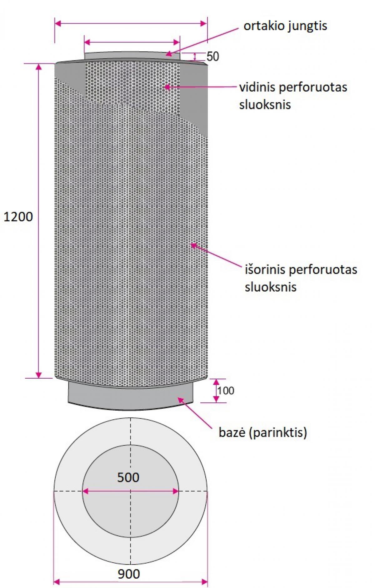 Difuzorius, skirtas didelio oro kiekio tiekimui mažu greičiu, cilindro formos, jungiamas tiesiai prie apvalaus ortakio, pagamintas iš dvigubo padengimo milteliniais dažais perforuoto plieno, artima RAL 9016 spalva, išorinis diametras Ø900 mm, ortakio pajungimo diametras Ø500 mm, aukštis 1200 mm, oras tiekiamas 360° spinduliu, be apatinio pado