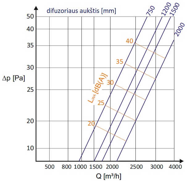 Slėgio kritimo Δp[Pa] ir akustinės galios lygio LWA[dB(A)] priklausomybė nuo oro srauto Q [m3/h].