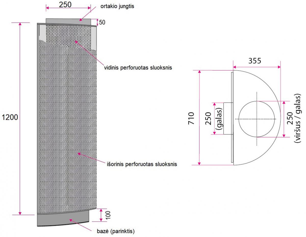 Ortakio pajungimo diametras Ø250 mm, plotis 710 mm, gylis 355 mm, aukštis 1200 mm, oras tiekiamas 180° spinduliu, be apatinio pado