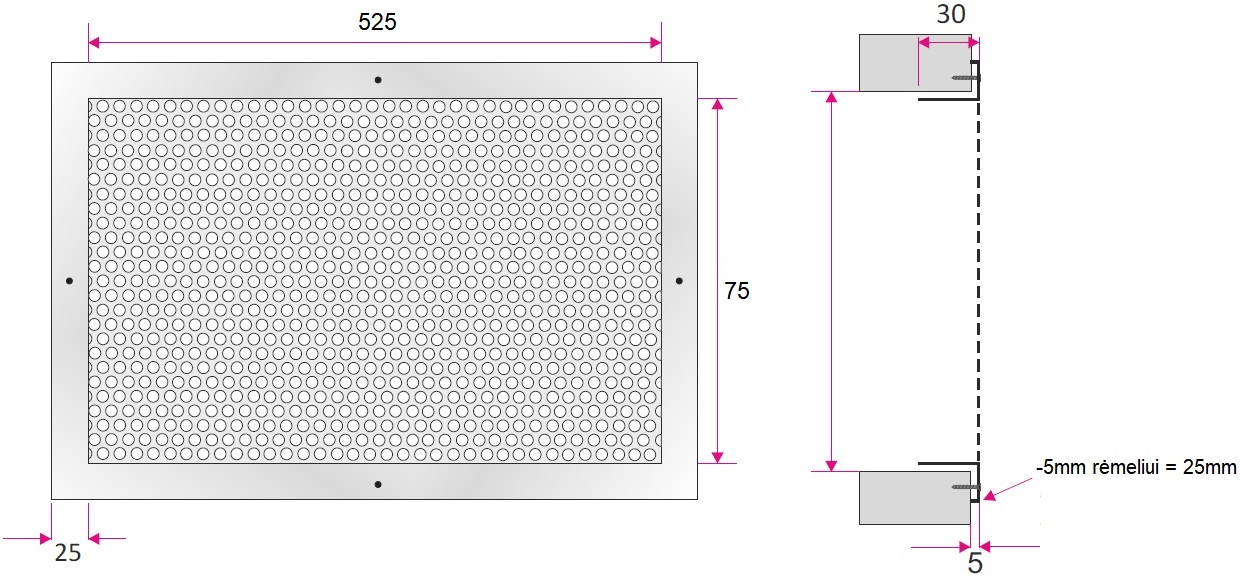 Ventiliacinės grotelės, perforuotos, montuojamos sienoje, lubose ar tiesiai ant ortakio, skirtos oro tiekimui arba šalinimui iš patalpos, stačiakampio formos, pagamintos iš milteliniu būdu dažyto cinkuoto plieno, RAL9016 spalva, tvirtinimas varžtais per išorinį rėmelį, montavimo angos matmenys 525x75 mm