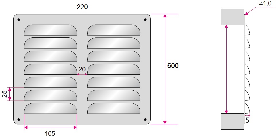 Ventiliacinės grotelės, presuotos nereguliuojamos grotelių mentės, skirtos oro tiekimui arba šalinimui iš patalpos, stačiakampio formos, užapvalinti kampai, pagamintos iš milteliniu būdu dažyto cinkuoto plieno, RAL9016 spalva, tvirtinimas varžtais per išorinį rėmelį, montavimo angos matmenys 220x600 mm, išoriniai matmenys 260x640 mm