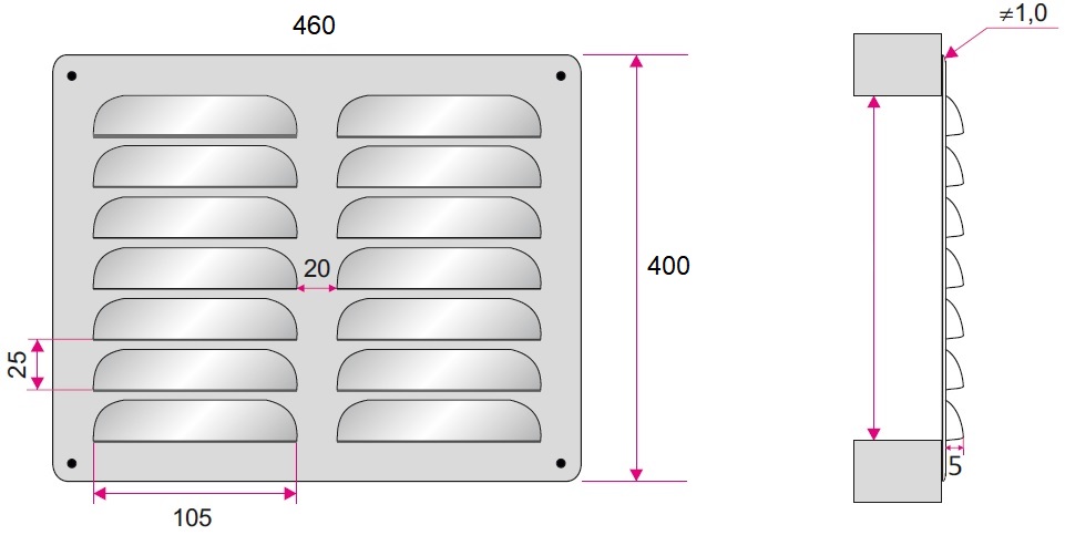 Ventiliacinės grotelės, presuotos nereguliuojamos grotelių mentės, skirtos oro tiekimui arba šalinimui iš patalpos, stačiakampio formos, užapvalinti kampai, pagamintos iš milteliniu būdu dažyto cinkuoto plieno, RAL9016 spalva, tvirtinimas varžtais per išorinį rėmelį, montavimo angos matmenys 460x400 mm, išoriniai matmenys 500x440 mm