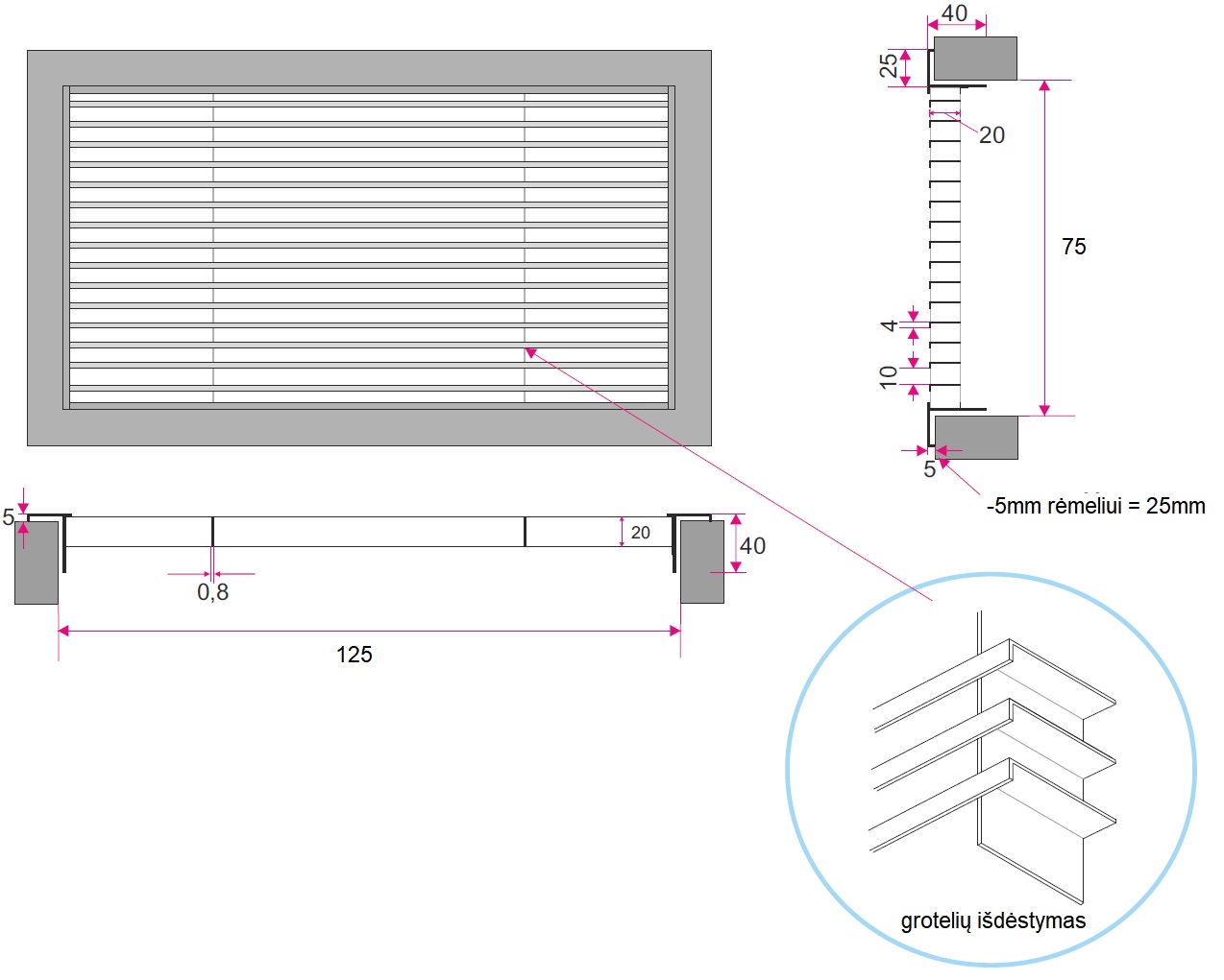 Surinkimas nematomas, skląsčiais grotelėse ir montavimo rėme RM arba dėžėje.