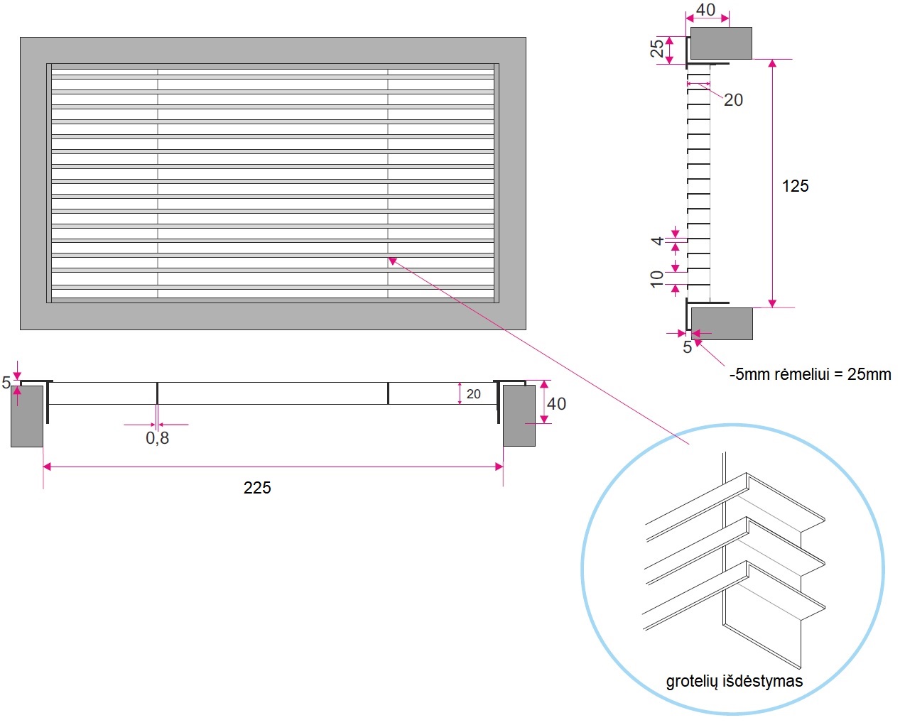 Surinkimas matomas, varžtais per montavimo skyles grotelių rėme.