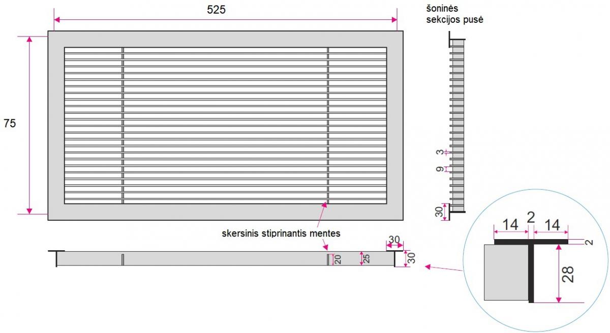 Ventiliacinės grotelės, sieninės, stačiakampio formos, horizontaliai išdėstytos nereguliuojamos grotelių mentės, pagamintos iš milteliniu būdu dažyto aliuminio, RAL9016 spalva, T-formos aliuminio rėmelis, tvirtinimas varžtais per išorinį rėmelį, montavimo angos matmenys 525x75 mm