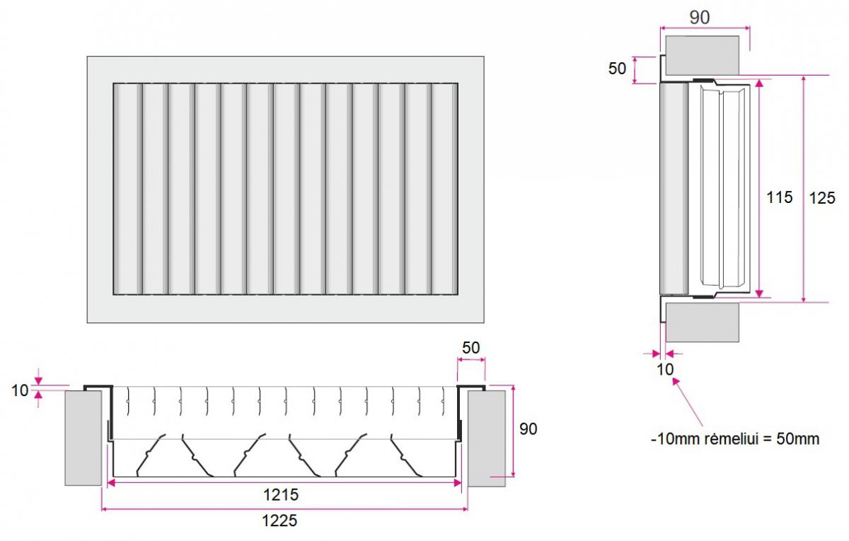 Išoriniai matmenys 1315x215 mm, oro tekėjimo angos matmenys 1215x115 mm, montavimo angos matmenys 1225x125 mm