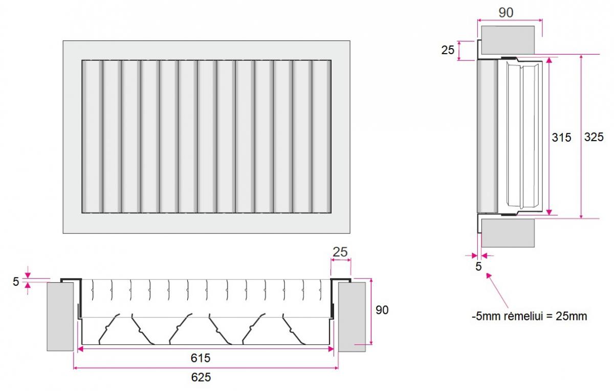 Išoriniai matmenys 665x265 mm, oro tekėjimo angos matmenys 615x215 mm, montavimo angos matmenys 625x225 mm