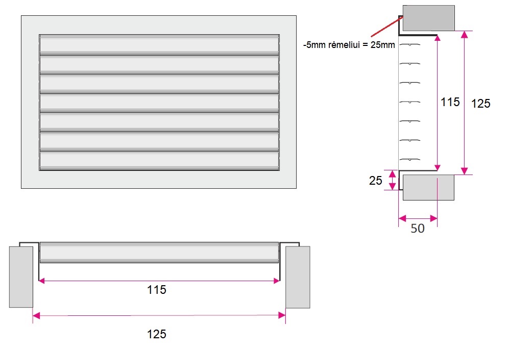 Išoriniai matmenys 465x115 mm, oro tekėjimo angos matmenys 415x65 mm, montavimo angos matmenys 425x75 mm
