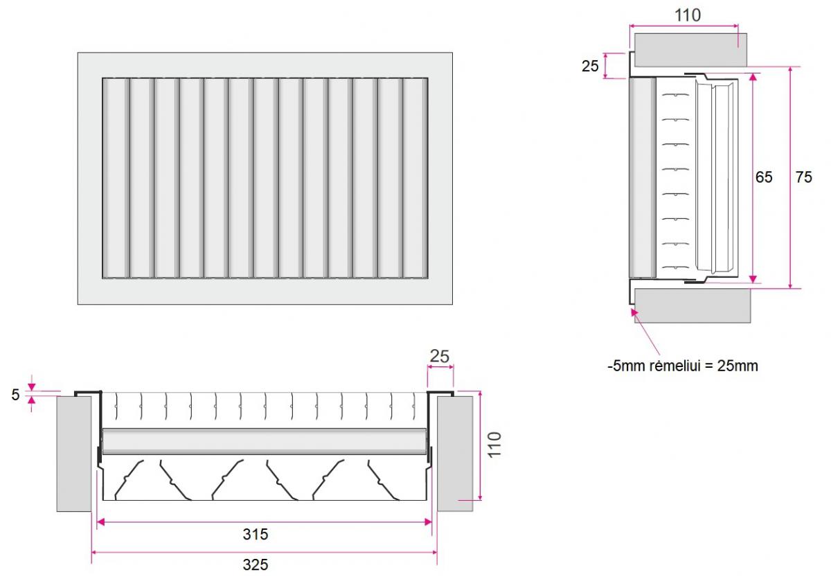 ST-W/S/GP/325x75/W1 Išoriniai matmenys 365x115 mm, oro tekėjimo angos matmenys 315x65 mm, montavimo angos matmenys 325x75 mm