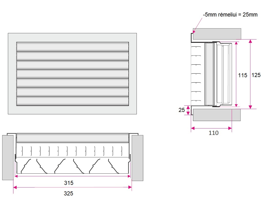 Išoriniai matmenys 365x115 mm, oro tekėjimo angos matmenys 315x65 mm, montavimo angos matmenys 325x75 mm