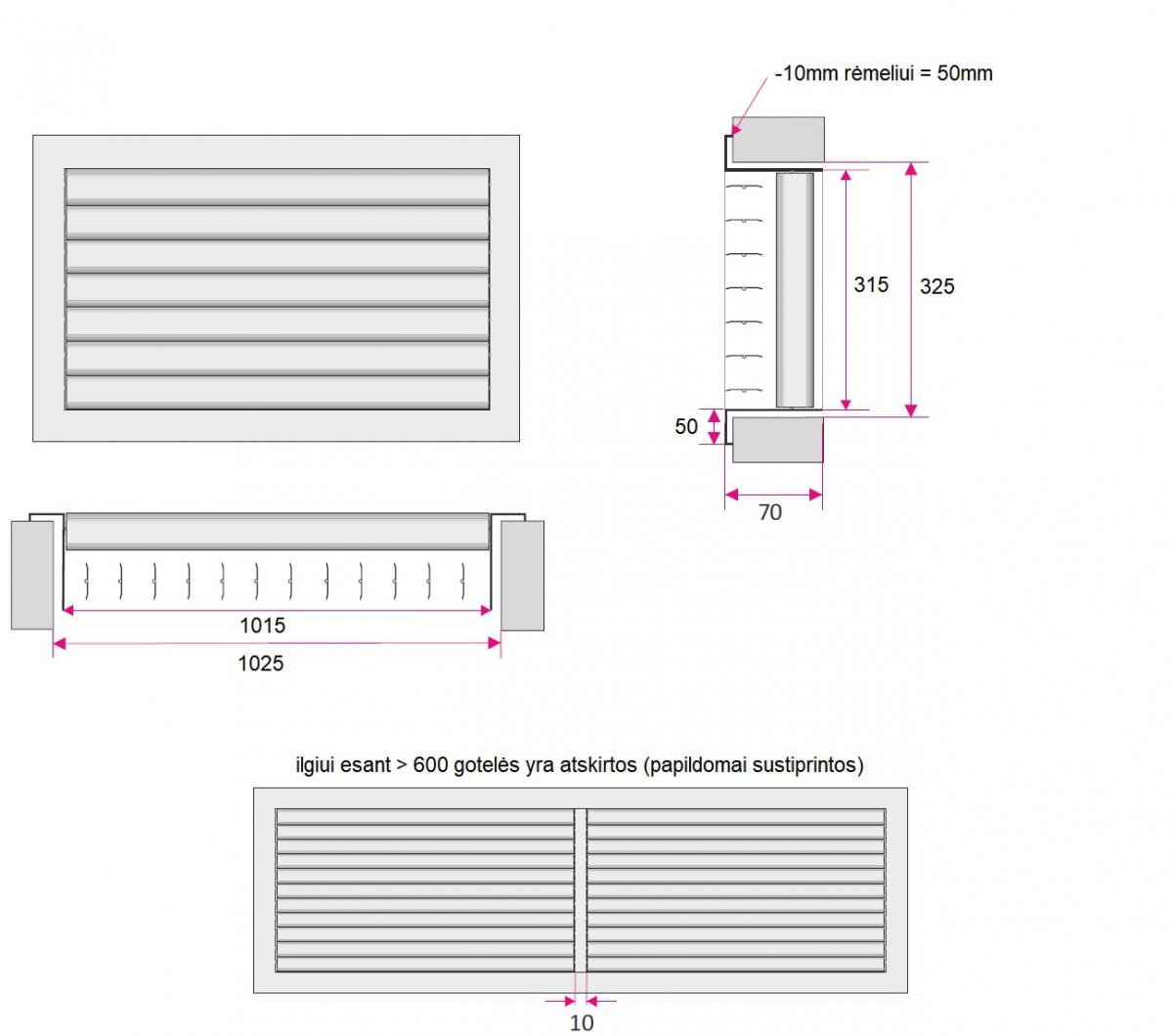 Išoriniai matmenys 665x115 mm, oro tekėjimo angos matmenys 615x65 mm, montavimo angos matmenys 625x75 mm