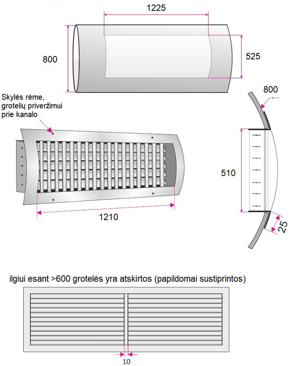 Ventiliacinės grotelės, išgaubtas rėmelis, skirtos montavimui į spiralinius ortakius, dvi eilės menčių kurių pirmoji išdėstyta vertikaliai, o antroji horizontaliai, rankiniu būdu viena nuo kitos nepriklausomai reguliuojamos grotelių mentės, pagamintos iš milteliniu būdu dažyto plieno, RAL9006 spalva, tvirtinimas varžtais per išorinį rėmelį, spiralinio ortakio skersmuo Ø800 mm, montavimo angos ortakyje matmenys 1225x525 mm, oro tekėjimo angos matmenys 1210x510 mm, efektyvus plotas 0.458 m²