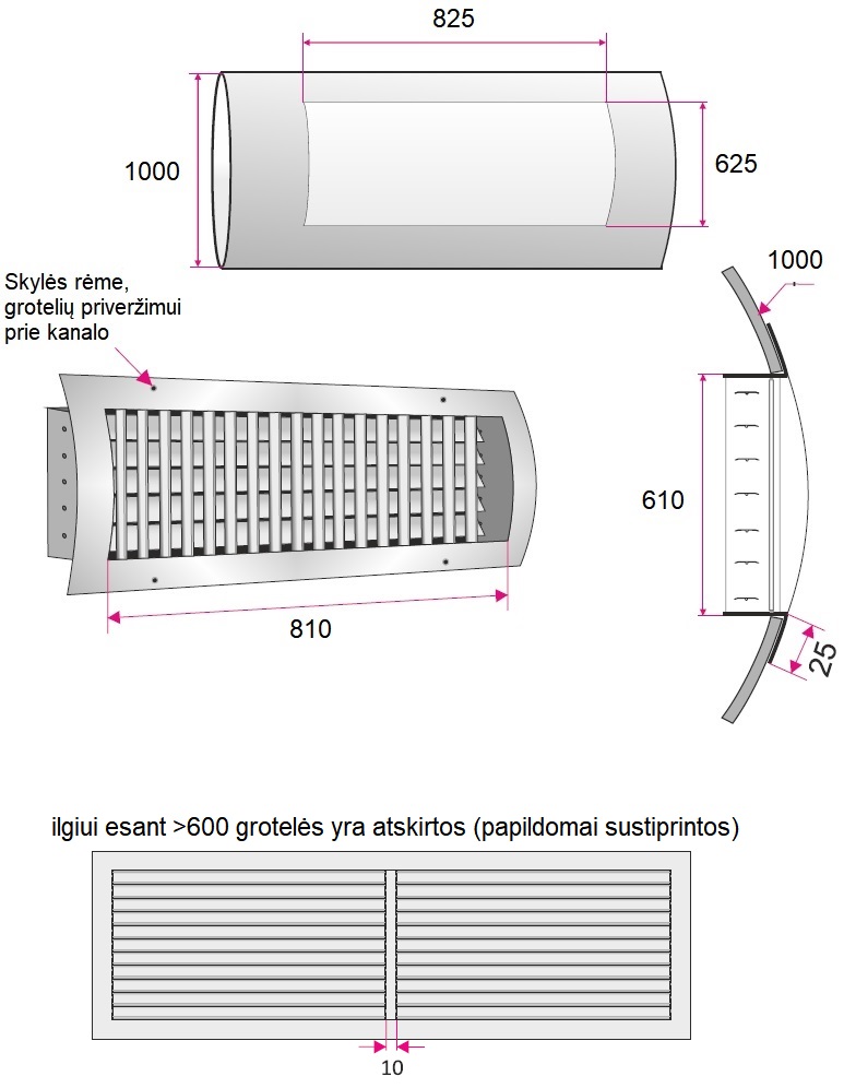 Ventiliacinės grotelės, išgaubtas rėmelis, skirtos montavimui į spiralinius ortakius, dvi eilės menčių kurių pirmoji išdėstyta vertikaliai, o antroji horizontaliai, rankiniu būdu viena nuo kitos nepriklausomai reguliuojamos grotelių mentės, pagamintos iš milteliniu būdu dažyto plieno, RAL9006 spalva, tvirtinimas varžtais per išorinį rėmelį, spiralinio ortakio skersmuo Ø1000 mm, montavimo angos ortakyje matmenys 825x625 mm, oro tekėjimo angos matmenys 810x610 mm, efektyvus plotas 0.355 m²