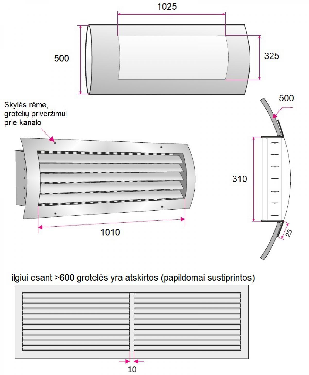 Ventiliacinės grotelės, išgaubtas rėmelis, skirtos montavimui į spiralinius ortakius, dvi eilės menčių kurių pirmoji išdėstyta horizontaliai, o antroji vertikaliai, rankiniu būdu viena nuo kitos nepriklausomai reguliuojamos grotelių mentės, pagamintos iš milteliniu būdu dažyto plieno, RAL9006 spalva, tvirtinimas varžtais per išorinį rėmelį, spiralinio ortakio skersmuo Ø500 mm, montavimo angos ortakyje matmenys 1025x325 mm, oro tekėjimo angos matmenys 1010x310 mm, efektyvus plotas 0.227 m²