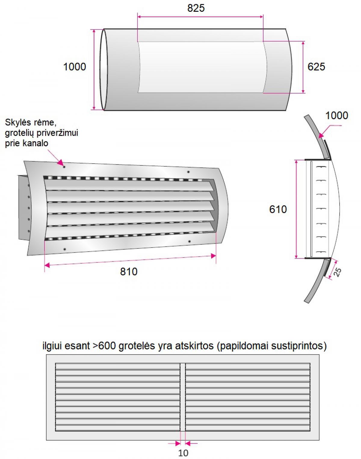 Ventiliacinės grotelės, išgaubtas rėmelis, skirtos montavimui į spiralinius ortakius, dvi eilės menčių kurių pirmoji išdėstyta horizontaliai, o antroji vertikaliai, rankiniu būdu viena nuo kitos nepriklausomai reguliuojamos grotelių mentės, pagamintos iš milteliniu būdu dažyto plieno, RAL9006 spalva, tvirtinimas varžtais per išorinį rėmelį, spiralinio ortakio skersmuo Ø1000 mm, montavimo angos ortakyje matmenys 825x625 mm, oro tekėjimo angos matmenys 810x610 mm, efektyvus plotas 0.355 m²