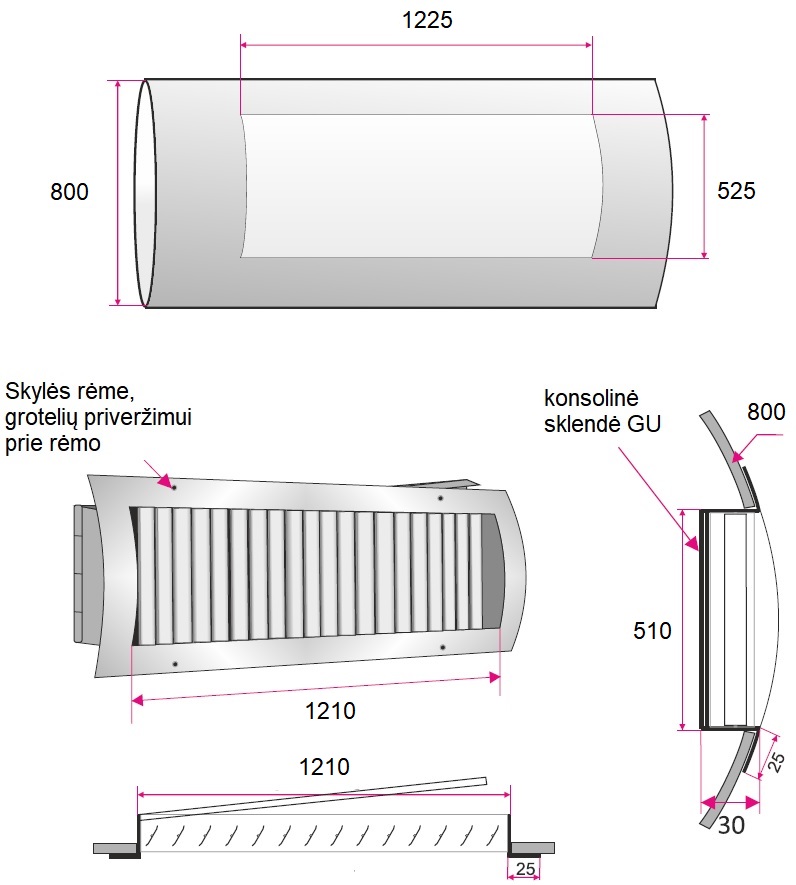 Ventiliacinės grotelės, išgaubtas rėmelis, skirtos montavimui į spiralinius ortakius, vertikaliai išdėstytos bei rankiniu būdu viena nuo kitos nepriklausomai reguliuojamos grotelių mentės, už kurių įmontuota konsolinė sklendė, pagamintos iš milteliniu būdu dažyto plieno, RAL9006 spalva, tvirtinimas varžtais per išorinį rėmelį, spiralinio ortakio skersmuo Ø800 mm, montavimo angos ortakyje matmenys 1225x525 mm, oro tekėjimo angos matmenys 1210x510 mm, efektyvus plotas 0.454 m²