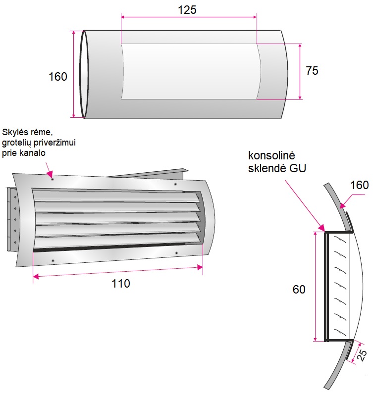 Ventiliacinės grotelės, išgaubtas rėmelis, skirtos montavimui į spiralinius ortakius, horizontaliai išdėstytos bei rankiniu būdu viena nuo kitos nepriklausomai reguliuojamos grotelių mentės, už kurių įmontuota konsolinė sklendė, pagamintos iš milteliniu būdu dažyto plieno, RAL9006 spalva, tvirtinimas varžtais per išorinį rėmelį, spiralinio ortakio skersmuo Ø160 mm, montavimo angos ortakyje matmenys 125x75 mm, oro tekėjimo angos matmenys 110x60 mm, efektyvus plotas ? m²