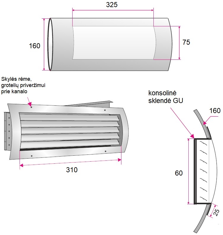 Ventiliacinės grotelės, išgaubtas rėmelis, skirtos montavimui į spiralinius ortakius, horizontaliai išdėstytos bei rankiniu būdu viena nuo kitos nepriklausomai reguliuojamos grotelių mentės, už kurių įmontuota konsolinė sklendė, pagamintos iš milteliniu būdu dažyto plieno, RAL9006 spalva, tvirtinimas varžtais per išorinį rėmelį, spiralinio ortakio skersmuo Ø160 mm, montavimo angos ortakyje matmenys 325x75 mm, oro tekėjimo angos matmenys 310x60 mm, efektyvus plotas 0.015 m²