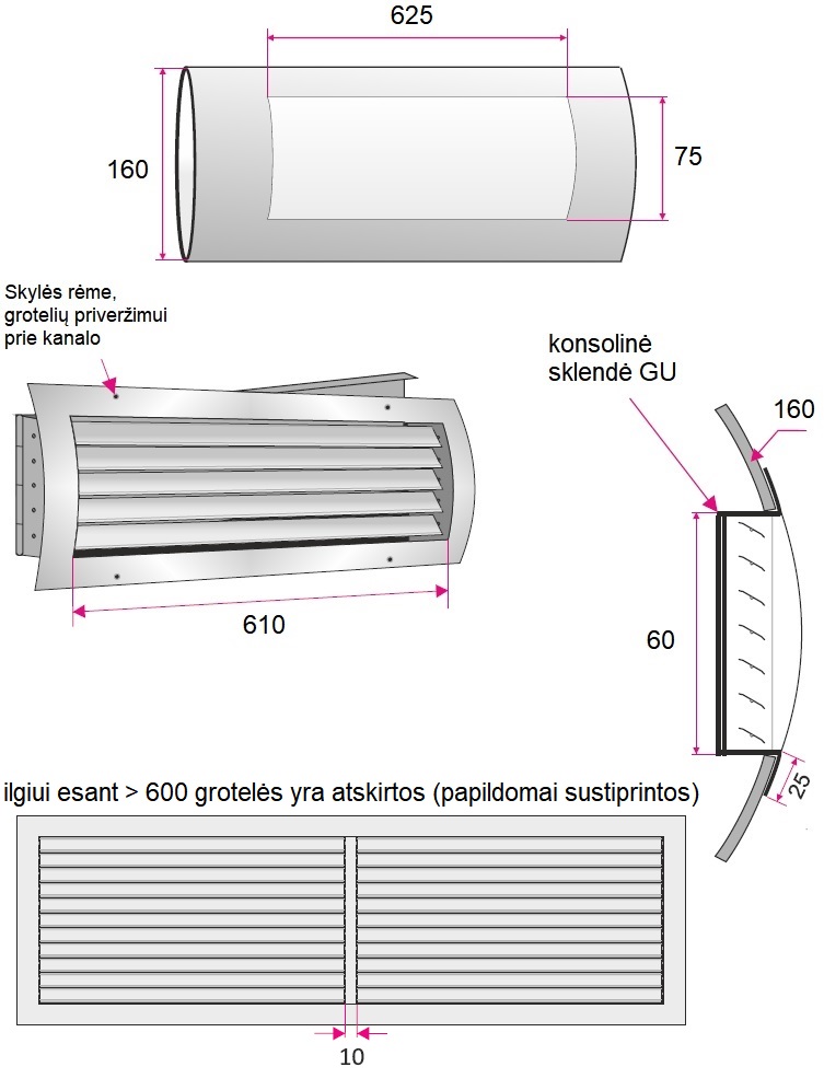 Ventiliacinės grotelės, išgaubtas rėmelis, skirtos montavimui į spiralinius ortakius, horizontaliai išdėstytos bei rankiniu būdu viena nuo kitos nepriklausomai reguliuojamos grotelių mentės, už kurių įmontuota konsolinė sklendė, pagamintos iš milteliniu būdu dažyto plieno, RAL9006 spalva, tvirtinimas varžtais per išorinį rėmelį, spiralinio ortakio skersmuo Ø160 mm, montavimo angos ortakyje matmenys 625x75 mm, oro tekėjimo angos matmenys 610x60 mm, efektyvus plotas 0.028 m²