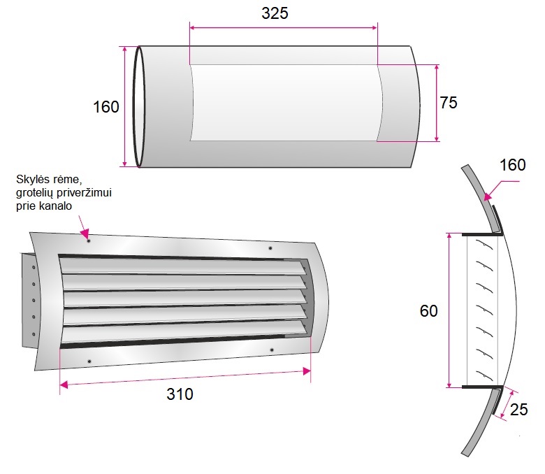 Ventiliacinės grotelės, išgaubtas rėmelis, skirtos montavimui į spiralinius ortakius, horizontaliai išdėstytos bei rankiniu būdu viena nuo kitos nepriklausomai reguliuojamos grotelių mentės, pagamintos iš milteliniu būdu dažyto plieno, RAL9006 spalva, tvirtinimas varžtais per išorinį rėmelį, spiralinio ortakio skersmuo Ø160 mm, montavimo angos ortakyje matmenys 325x75 mm, oro tekėjimo angos matmenys 310x60 mm, efektyvus plotas 0.015 m²