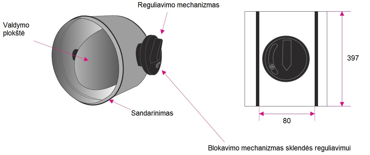 Ventiliacinė sklendė, Vienvėrė, skirta oro srauto reguliavimui apvalių ortakių vėdinimo sistemose, su sandarinimo tarpinėmis moviniam pajungimui, pagaminta iš cinkuoto plieno, reguliuojama rankiniu būdu su mechanine rankenėle, ventiliacinio ortakio skersmuo Ø400 mm, sklendės išorinis skersmuo Ø397 mm