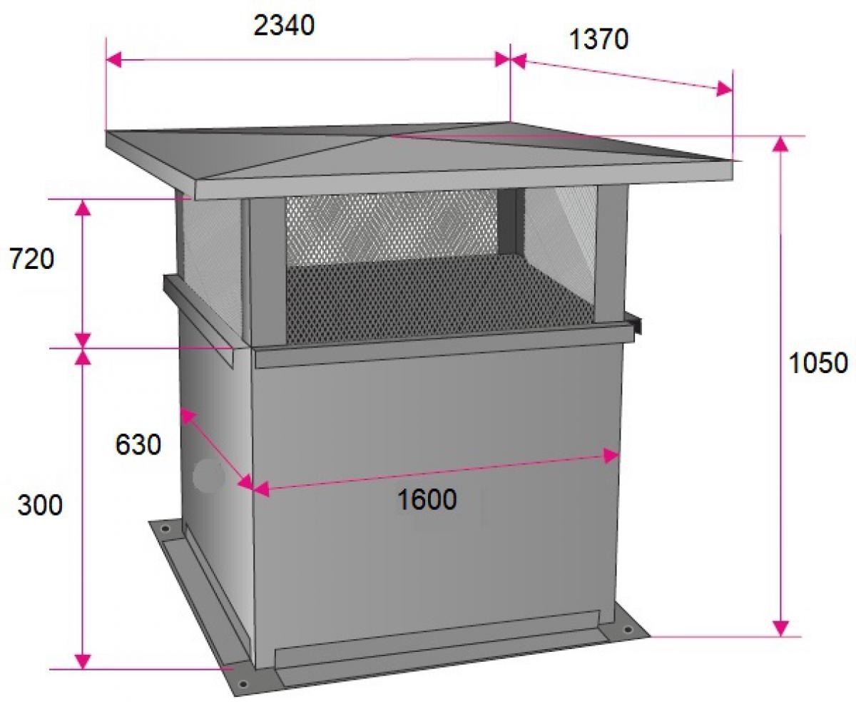 CzWD-A/630x1600/720/1050 Pajungimo matmenys 630x1600 mm, apsauginio stogelio nuo kritulių matmenys 1370x2340 mm, ventiliacinės angos aukštis 720 mm, bendras aukštis 1050 mm