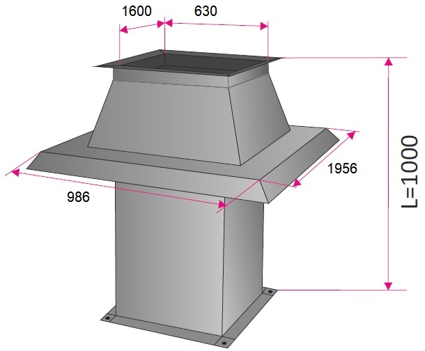Stoginis pagrindas, stačiakampio formos pajungimas, pagamintas iš cinkuoto plieno, pajungimo matmenys 630x1600 mm, apsauginio stogelio nuo kritulių matmenys 986x1956 mm, aukštis 1000 mm