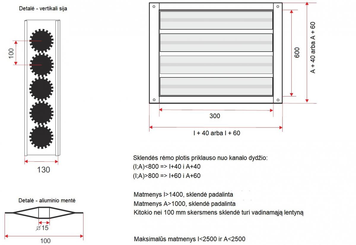 Ventiliacinio ortakio matmenys 300x600 mm, sklendės montavimo flanšo išoriniai matmenys 340x640 mm